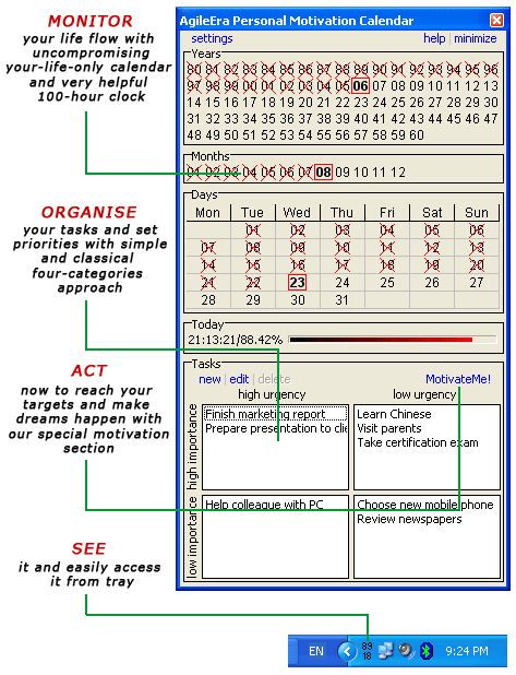 Персональный Мотивирующий Календарь - это простая в установке и использовании программа для самомотивации. Она помогает визуально представить течение жизни с помощью бескомпромиссного календаря, отображающего прожитые годы, месяцы и дни, а также представляет прошедшее время суток в процентном виде (часы, отображаемые в области уведомлений, в которых не 24, а 100 часов), и представляет механизмы, упрощающие определение и достижение краткосрочных и долгосрочных целей, и повышение уровня самомотивации при их реализации.