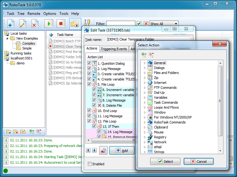 RoboTask позволяет Вам автоматизировать любые задачи на вашем компьютере, в пределах от простого запуска веб-страниц до проверки и посылки email, перемещения или резервного копирования файлов, загрузки на удаленный компьютер или скачивания и многое другое. Программа позволяет Вам легко создавать как простые так и весьма сложные задачи , используя условный оператор IF/ELSE, циклы, переменные пользователей и другие дополнительные опции. Он может приспосабливать почти любой тип простой или сложной задачи без необходимости создавать пакетные файлы или писать сложные скрипты, поскольку она использует визуальный интерфейс, который позволяет Вам просто выбирать и комбинировать действия под ваши потребности. Широкая поддержка условий запуска позволяет Вам не только создавать задачи, но и выполнять их автоматически, если происходят некоторые события (например, если файл перемещен, если Ваша связь с интернетом отключена и т.д.). RoboTask может быть запущен как служба NT, позволяя Вам автоматизировать имеющиеся задачи, даже если Вы не залогированы. RoboTask может использовать кто угодно! Несмотря на мощь и гибкость RoboTask, он очень прост в использовании. Не надо быть программистом , чтобы создавать Ваши собственные решения автоматизации легко и быстро. Даже несколько минут общения с RoboTask дадут Вам множество идей, как увеличивать Вашу производительность. Конечно, каждый хочет избежать потери важных данных. Позвольте RoboTask-у позаботиться об этом. RoboTask может делать для Вас следующие вещи: запускать приложения и открывать документы; управлять автоматическим резервным копированием; предупреждать Вас о любых изменениях в Ваших папках; закрыть Windows и выключить Ваш компьютер; обрабатывать файлы и папки; работать с FTP и Web-серверами; посылать сообщения и файлы электронной почтой; работать как будильник и многое другое. Почему не позволить RoboTask-у делать рутину за Вас? Полное описание »