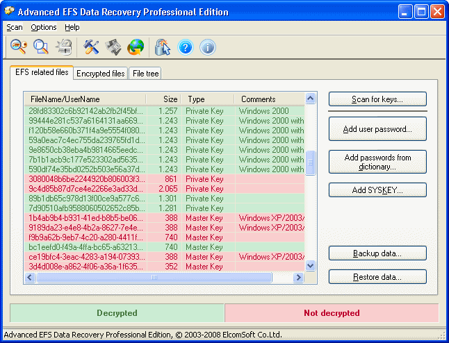 Advanced EFS Data Recovery эффективно восстанавливает защищенные средствами EFS файлы даже в тех случаях, когда все другие методы расшифровки и восстановления не действуют. Сканирование жесткого диска на низком уровне и просматр хранимых данных сектор за сектором позволяет Advanced EFS Data Recovery восстанавливать зашифрованые файлы и папки даже в том случае, когда некоторые ключи шифрования повреждены или безвозвратно утеряны.