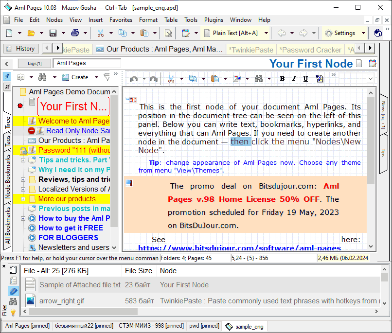 Aml Pages это развитый органайзер для оперативных записей, ведения дневников, каталогов и тому подобных записей. Если Вы часто что-то "записываете на манжетах", сохраняете на потом, откладываете на завтра - то Aml Pages, то что Вам нужно. Aml Pages - это оперативный блокнот, который идеально подходит, когда нужно записать нечто важное, записать быстро, без запуска громоздких приложений - и все записанное ни в коем случае не потярять в море подобных данных. Среди основных возможностей Aml Pages можно перечислить следующие: Иерархическая структура разделов в документах пользователя. Поддержка как простого, так и текста с форматированием. Сохранение в разделах текста рисунков и объектов OLE. Встроенные веб страницы. Плавающие листочки (заметки, стики) как неотделимая часть документа. Установка паролей на документы и шифрование отдельных разделов по паролю пользователя. Мощные возможности поиска как в любой части документа, так и в целых множествах документов на диске. Развитые возможности создания копий и автоматического резервного копирования. Синтаксическая подсветка любых языков программирования и форматов данных. Автотекст, для вставки часто используемых выражений и тегов. Поддержка как внешних, так и внутренних, между разделами, гиперссылок. Встроенный алгоритм упаковки данных на лету, при сохранении документа. Категории страниц, значки разделов и настройки цветов отдельные для каждого раздела. Множество плагинов Aml Pages, расширяющих и дополняющих основную программу. Удобный и настраиваемый пользовательский интерфейс. Интеграция с веб браузером и электронной почтой. Компактные документы и небольшой размер самой программы. Максимальная независимость от версии Windows и мощности компьютера. Полное описание »