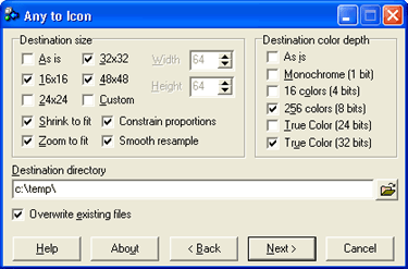 Посмотреть скриншот Any to IconAny to Icon преобразует BMP, JPEG, GIF, PNG, PSD, WMF, WBMP, PCX, TIFF, XPM, XBM и CUR форматы в иконки Windows. Вы можете добавлять файлы и каталоги из Проводника или другой файловой оболочки методом перетаскивания. Вы также можете вставлять изображения из буфера обмена и настраивать глубину цвета и размеры создаваемых иконок. Возможно конвертировать 256-цветные иконки в True Color иконки и наоборот.