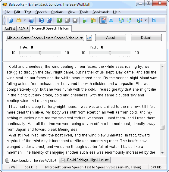 Программа "Балаболка" предназначена для чтения вслух текстовых файлов. Для воспроизведения звуков человеческого голоса могут использоваться любые речевые синтезаторы, установленные на компьютере. Воспроизведение речи можно контролировать при помощи стандартных кнопок, подобных тем, что присутствуют в любой мультимедийной программе ("воспроизвести/приостановить/остановить"). Программа умеет читать вслух содержимое буфера обмена, показывать текст, содержащийся в файлах форматов AZW, CHM, DjVu, DOC, EPUB, FB2, HTML, MOBI, ODT, PDF, PRC и RTF, изменять настройки шрифта и цвета, управлять процессом чтения из системного трея (области уведомлений) или при помощи глобальных сочетаний клавиш, произносить набираемый на клавиатуре текст, проверять орфографию, делить текстовый файл на несколько частей. "Балаболка" предоставляет возможность удалить из текста все знаки переноса на концах строк; это позволит избежать запинок при чтении слов. Текст может быть сохранен в виде аудиофайла (поддерживаются форматы WAV, MP3, OGG и WMA). Программа умеет работать с различными версиями пакета речевых функций Microsoft Speech API (SAPI); также присутствует поддержка Microsoft Speech Platform. Он позволяет изменять скорость и тембр речи. Пользователь может использовать специальный список замен для улучшения качества воспроизведения речи. Это полезно в тех случаях, когда есть необходимость изменить произношение слов или отдельных слогов; для этого некоторое выражение в тексте заменяется на необходимое читаемое выражение. Для записи подобных правил замены используется синтаксис регулярных выражений. Полное описание »