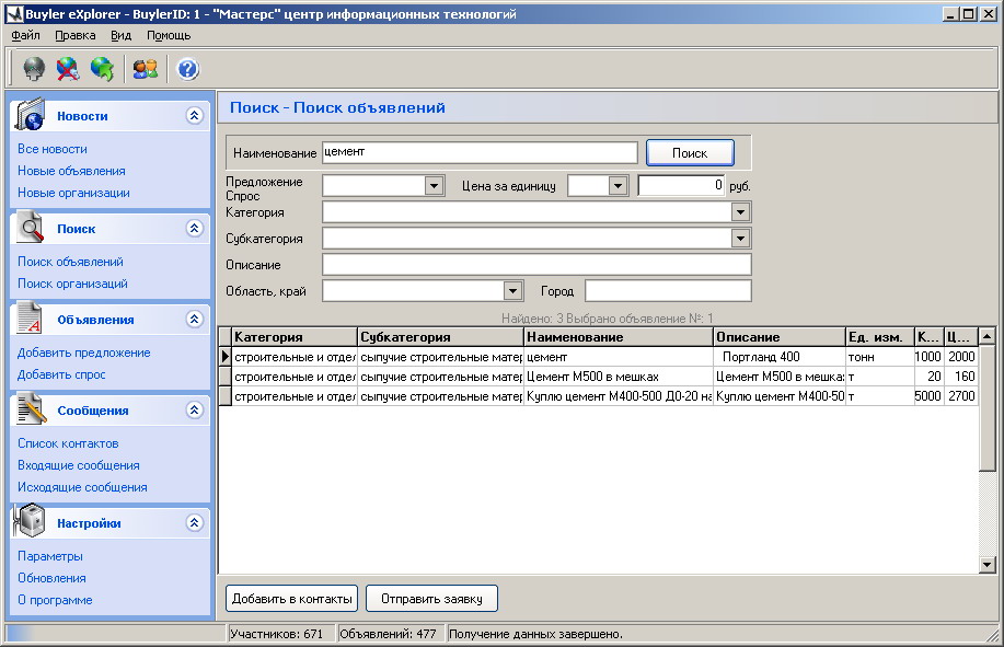Также, как и в случае поиска организаций, есть возможность Добавить в контакты организацию, разместившую данное объявление, или немедленно отправить заявку на преобретение или продажу. Полное описание »