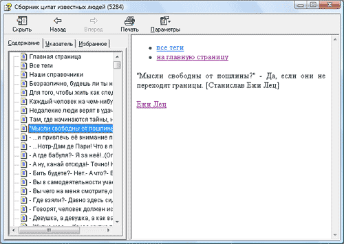 Аврелий, Диоген, Киплинг, Ежи Лец, Овидий, Конфуций, Достоевский, Гегель, Вольтер, Сенека, Тургенев, Жванецкий, Эйнштейн, Монтень, Пруст, Гёте, Боккаччо, Цицерон, Лермонтов - лишь капля в море людей, цитаты которых вы сможете найти в данном сборнике. Также в сборнике представлены цитаты из популярных советских кинофильмом: 12 стульев, Джентельмены удачи, Кавказкая пленница, Операция Ы, и др. На данный момент в справочнике содержится 5284 цитаты, собранные по материалам сайта http://www.onestyle.com.ua/ Полное описание »