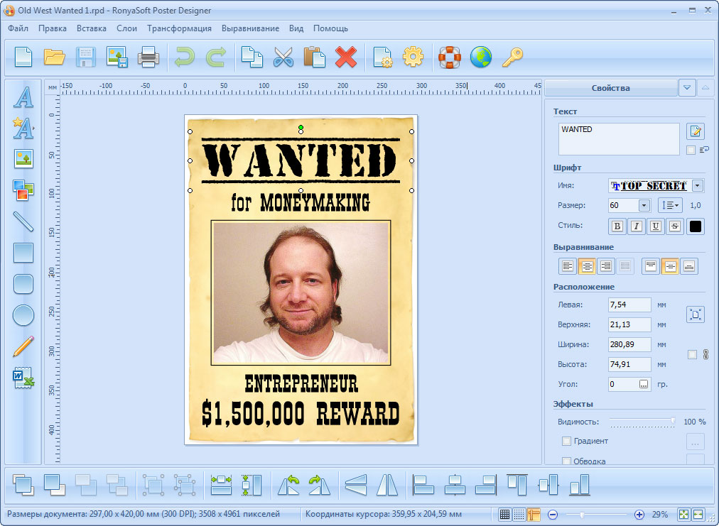RonyaSoft Poster Designer - легкая в использовании программа для дизайна и печати привлекательных постеров, баннеров, сертификатов и знаков. Коллекция готовых шаблонов плакатов и интуитивный пользовательский интерфейс позволяют создавать собственные постеры, баннеры, сертификаты и знаки практически за несколько кликов. Любая деталь в шаблоне постера, баннера, сертификата или знака может быть изменена соответственно вашим требованиям, например: рисунок, текст, цвет, размер, стиль и т.п. Мастер печати поможет распечатать плакаты, баннеры, сертификаты и знаки на домашнем или офисном принтере. Также вы сможете экспортировать плакаты в изображения для печати в службах печати или для использования в блогах, на форумах или социальных сайтах. Возможность печати многостраничных постеров и баннеров также предусмотрена. Следующие шаблоны включены в программу: плакат “Разыскивается”, постер “Фильм“, плакат “Обложка журнала”, постер “Бигборд”, плакат “Человек года ”, плакат “Рождество“, постер “Пасха“, плакат “День Валентина“, плакат “Хеловин“, постер “День Рождения“, плакат “Свадьба“, постер “Вечеринка”, постер “Реклама товара“, плакат “Скидки“, постер “Для продажи“, “Мотивационный“ плакат, “Научный“ постер, плакат “Победитель”, плакаты в стиле “Жизнь“, коллажи, забавные знаки, запрещающие знаки, предупреждающие знаки, бланки сертификатов, шаблоны раскрасок для детей и прочее. Полное описание »