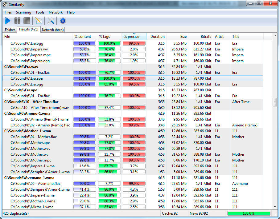 Программа предназначена для сравнения и поиска похожих (дубликатов) музыкальных файлов (MP3,WMA и без потерь). Анализ производится по содержимому файла, стоит отметить что проверяется именно схожесть звуковой части, используя различные алгоритмы FFT, Wavelet, мат.статистику, т.е. никакого побитового сравнения не производится, поэтому программе необходимо декодировать музыкальный файл. Также программа может сравнивать по значениям ID3, ASF тэгов и имен файлов. Особенностью программы является то что она подсчитывает некую оценку файла и не требует постоянного присутствия носителя с файлом, другими словами файлы для анализа можно указывать на временных носителях CD-ROM, DVD-ROM, flash, они все равно будут участвовать в сравнении корректно. Полное описание »
