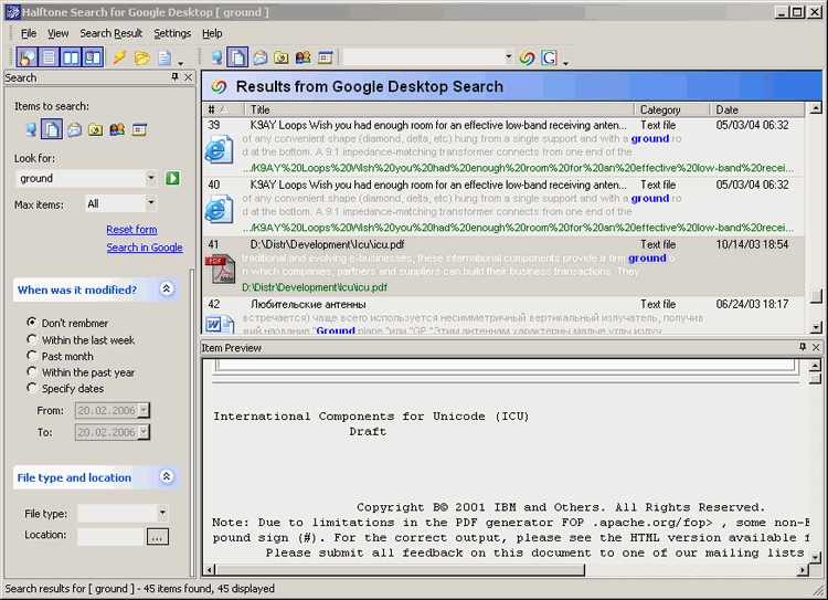 Google Desktop - свободная программа доступная для загрузки на веб-сайте Google. Этот мощный инструмент позволяет искать файлы на вашем компьютере также как вы ищете информацию в сети используя Google или Yandex. Но то, что прекрасно в целом, может не быть прекрасным в каждом конкретном случае. Halftone Search это бесплатное дополнение к Google Desktop, которое предоставляет расширенные возможности для пользователей MS Windows.
