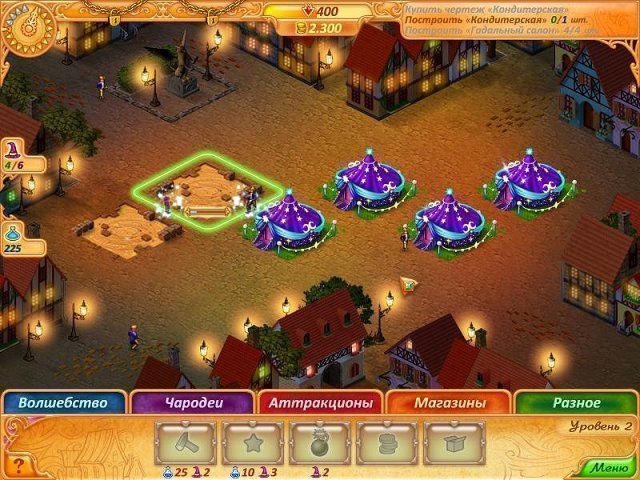 Периодически на ваши ярмарки будут нападать волосатые орки. Если вы не успеете вовремя отреагировать, то они ограбят магазины, и товар придется доставлять туда заново. А вот если вы успеете заметить появление непрошенных гостей и кликните по ним, то они превратятся в волшебство, которое, сами понимаете, можно пустить на добрые дела. Дела эти будут вершить чародеи. И чем больше вы их наймете, тем быстрее решите поставленные задачи. Побольше вам улыбок!