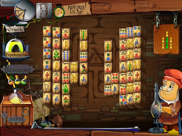 Первое, с чего нужно начать, — это соответствующим образом оборудовать мастерскую гнома-алхимика. Играйте в маджонг: убирайте пары фишек и получайте нужные предметы! Хоппи не оставит вас без помощи: он приготовит волшебный эликсир, чтобы перемешивать фишки, и достанет из тайника сосуды с подсказками. А если не будете знать, сколько пар фишек можно убрать в настоящий момент, то посмотрите на выражение лица Хоппи. Улыбка или нахмуренные брови гнома станут для вас ответом.