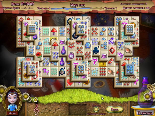 В этой игре вы отправитесь вместе с Алисой в путешествие по чудесной стране Маджонг. Чтобы добраться от Белого Кролика к Синей Гусенице и дальше — к Чеширскому Коту, Мартовскому Зайцу, Шляпнику, Соне, а потом попасть в королевский дворец, вам нужно будет разложить 175 головоломок в лучших традициях маджонга.