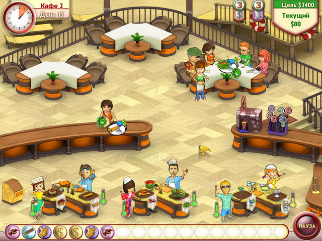 Сотрудники вашего кафе специализируются на разных блюдах. Антонио готовит салаты, Хина — омары, Мартин — роллы, Натали — специалист по десертам, Хельга — мороженщица, а Гарольд делает отличные коктейли. Учтите это при распределении работы — сэкономите массу времени. Не все блюда готовят повара, некоторые продукты используются в готовом виде: кола, леденцы, кофе со льдом. Главное — заказать их заранее, чтобы они всегда были в ассортименте.