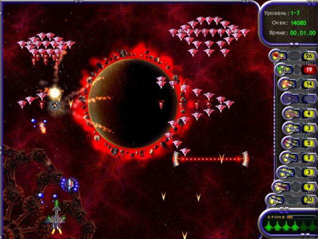 К счастью, вы можете улучшать свой истребитель, собирая среди обломков вражеских кораблей дополнительное супер-оружие и энергетические ячейки, подпитывающие силовую броню. Также будут крайне полезными и специальные бонусы, с помощью которых можно увеличивать мощность основного орудия на вашем корабле.