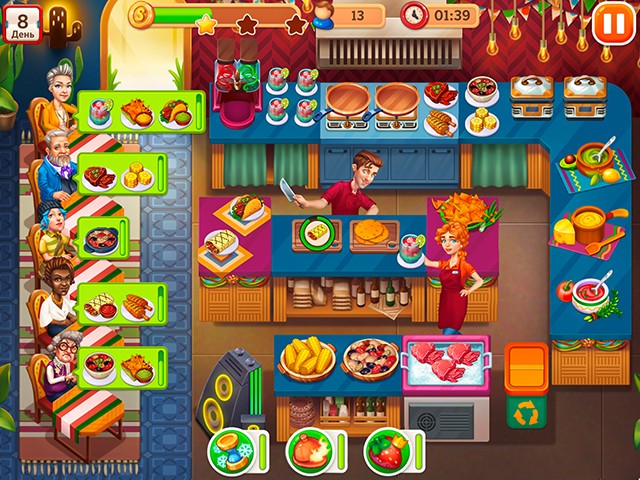 В игре есть два режима сложности, обычный и простой. Кроме этого, вы сможете улучшать инвентарь, утварь и продукты. Для прохождения уровней на наилучший результат вам пригодятся бонусы: премиальные продукты, заморозка времени и моментальное исполнение заказа.