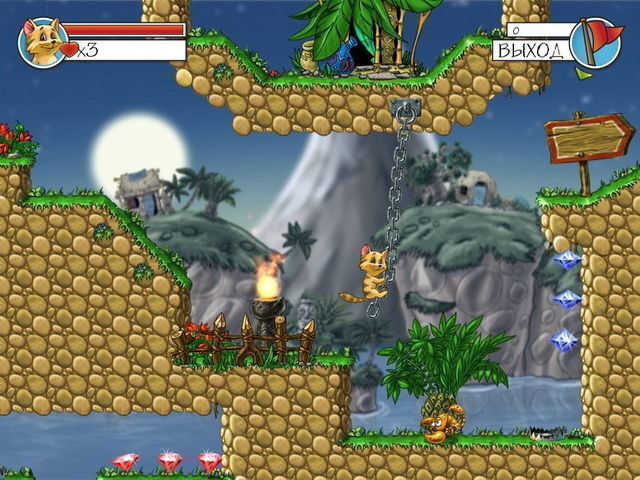 По пути вам нужно будет собирать сокровища, которые приносят очки. За каждые 20 000 очков уровень энергии у котенка будет восстанавливаться, и он сможет снова продолжать экспедицию с удвоенными силами. Кроме того, на некоторых уровнях спрятаны дополнительные жизни, которые очень пригодятся в дальнейшем.