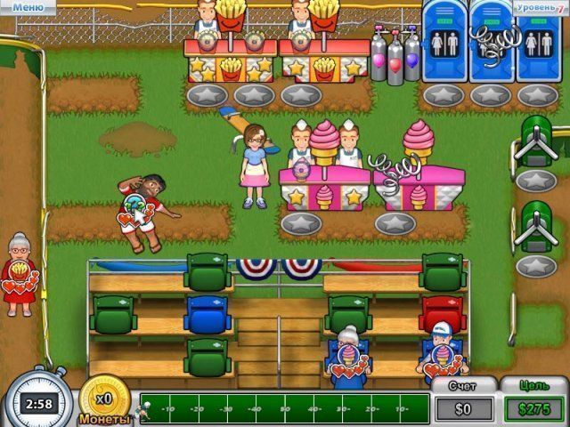 Нужно облагородить стадион и вернуть веру в себя футболистам Ляпвилля! С чего начать? Прежде всего наладьте работу кафе у стадиона. Болельщики с удовольствием купят мороженое или пакет чипсов перед матчем — без клиентов вы не останетесь! Главное, суметь быстро и качественно их обслужить.