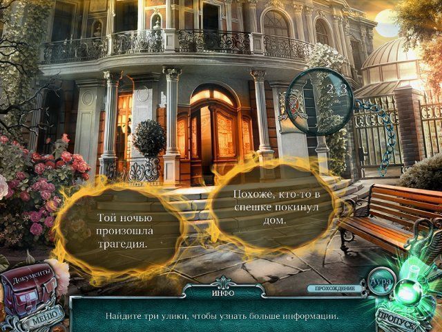 Обязательно пообщайтесь с сестрой, дочерью и подругой погибшего. Эти дамы явно что-то скрывают. Здесь помогут ваши дедуктивные и паранормальные способности. Волшебная аура приоткроет вам дверь в мир призраков и поможет найти улики. В таком запутанном деле портфель сыщика тоже пригодится. С помощью пудры и скотча вы сможете снять отпечатки пальцев. А благодаря карте вам будет проще ориентироваться в доме. Также к вашим услугам очень полезная штука — телепорт: мгновение — и вы в нужном месте!