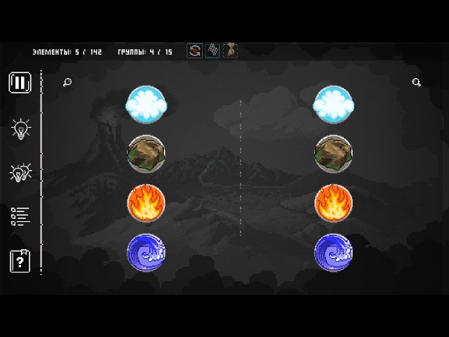 Из уже готовых элементов — воды, воздуха и камня — вы можете создать кое-какие новые элементы. А уж потом ваши фантазия и смекалка понесутся в такие неизведанные дали, что только успевай их держать! Подсказка вам предложит создать, например, яйцо, а уж вы должны будете догадаться, что яйцо дадут вам такие элементы, как камень и жизнь.