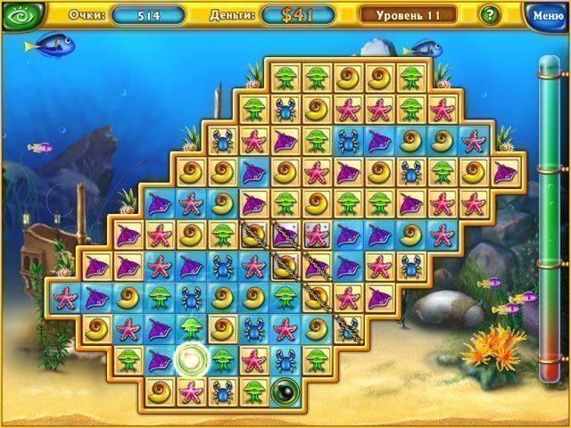 На все эти усовершенствования нужны деньги — таков непреложный закон жизни. Заработать необходимое количество наличных предельно просто: собирайте золотые плитки, размещенные на уровне. Для этого двигайте по игровому полю фишки в виде обитателей морских глубин с таким расчетом, чтобы в итоге получилась линейка не менее чем из 3 одинаковых элементов.