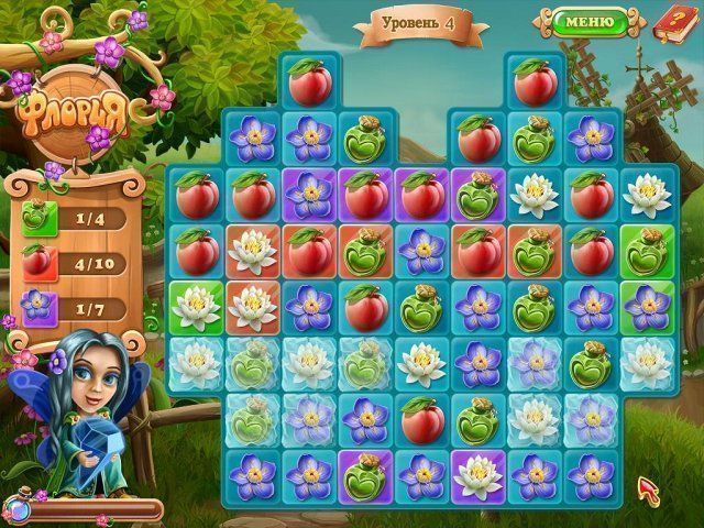 Впереди у вас 90 задачек «три в ряд», в которых нужно собирать комбинации из трех одинаковых фишек, чтобы удалить их с поля. При этом вы должны ухитриться и выполнить план по сбору магических плиток на уровне. Сразу скажем: это не так-то просто! Чтобы положить плитку в копилку, на ней нужно составить комбо из фишек того же цвета. Например, сиреневые плитки убираются только фиалками, красные – яблоками.