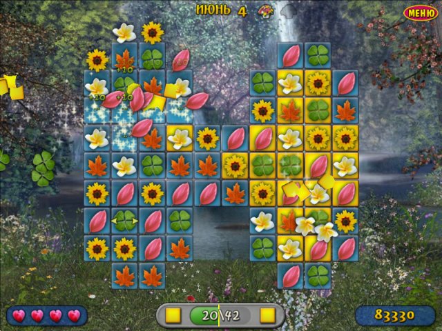 На игровом поле "Цветочной долины" расположено множество цветков различных сортов и оттенков. Ваша задача — передвигать их левой кнопкой мыши таким образом, чтобы в результате каждого хода получалась группа из одинаковых элементов. Итоговая комбинация может быть любой формы, но она должна состоять не менее чем из 3 одинаковых цветков.