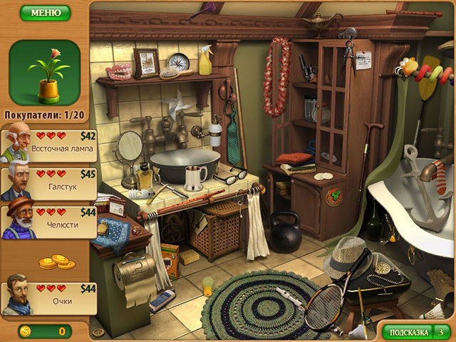 А вот и первые покупатели! Их интересуют перья любого цвета и длины. Внимательно осмотрите гостиную, там наверняка найдется несколько штук. Отыщите их все и отдайте посетителям — они уйдут довольными и хорошо заплатят. Этому старичку нужна шляпа, эффектной блондинке — помада и духи, студентке — старинный свиток и зеркальце. Кто бы мог подумать, что спрос на безделушки, которыми особняк завален сверху донизу, окажется таким высоким! В столовой уже столпились люди, и каждый хочет купить себе что-нибудь из посуды. Не разочаровывайте гостей и среди всякой всячины быстро отыщите все, что нужно.