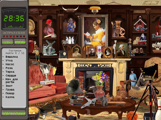 К сожалению, для работы этого чудесного агрегата нужно большое количество энергии, поэтому полагаться по большей части придется на собственное чутье. В левой части экрана вы увидите список вещей, которые необходимо отыскать на картинке. Важно помнить, что нужная штуковина может быть запрятана где угодно! Не удивляйтесь, если вы обнаружите насос, приклеенный к потолку, или плавающую в аквариуме отвертку. Полтергейст — дело тонкое!