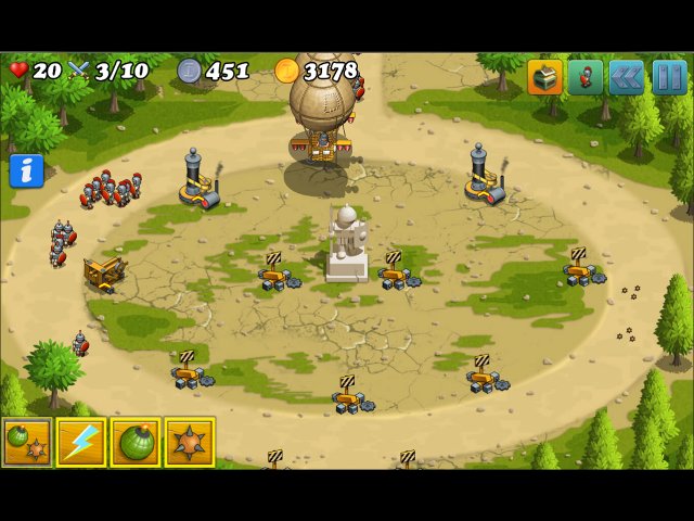 Выставляйте орудия вдоль дороги и, не дожидаясь атаки, жмите иконку "Щит и мечи" — противник начнет наступать. Против пехоты используйте "Баллисту" или "Мортиру", электрическими разрядами можно победить механоидов и уничтожить броневики. Также в вашем распоряжении есть смертоносные бонусы: молнии Зевса, гранаты и шипы — на поле брани они позволяют лично вмешаться в события.