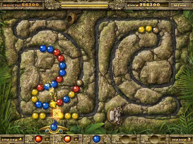Испытайте судьбу и попробуйте отыскать этот бесценный клад. Однако задачка эта будет не из простых: путь к храму преграждает множество головоломок. Игровое поле представляет собой каменную плиту с вырезанным желобом, по которому непрерывно движется цепочка из разноцветных шариков. Вам необходимо двигать каретку и запускать цветные фишки с таким расчетом, чтобы в результате каждого хода получилась группа как минимум из 3 шариков одного цвета. В случае удачного хода шарики исчезнут, а вы заработаете немного золота.