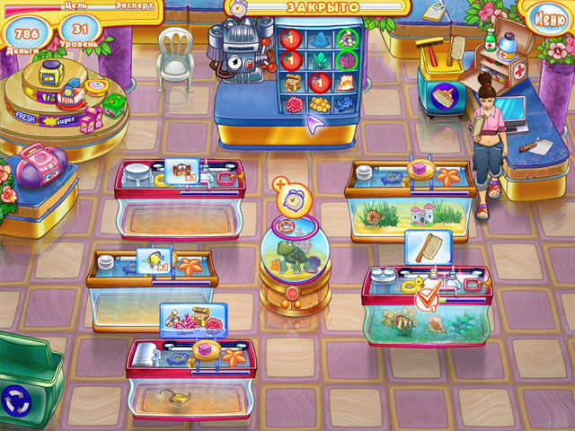 Постепенно, шаг за шагом, вы сможете обставить магазин самыми современными средствами по уходу за морскими обитателями, а также завести самых требовательных, но и самых дорогих рыбок.