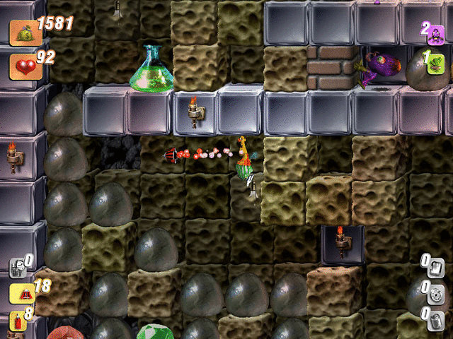 Обратите внимание на тот факт, что взрыв ракеты или бомбы может уничтожить не только монстра, но и ближайшие сокровища. Именно по этому в игре необходимо задействовать логическое мышление, чтобы и врагов победить, и набрать максимальное количество очков.