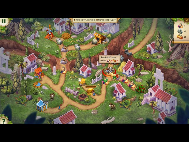 Чтобы заполучить эти ресурсы, к ним нужно будет расчистить дорогу. На первых порах это будет не так уж и трудно сделать. А вот на последующих уровнях устранение препятствий и постановка первоначальных задач потребуют не только физических усилий, но и логики и смекалки. Старайтесь в первую очередь строить специальные здания — кухни, мастерски и шахты, — которые будут производить все, что нужно для прохождения уровня.