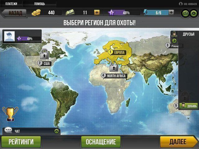 Для того, чтобы добыть трофей, вам понадобится оружие и экипировка, которые можно приобрести перед каждой охотой. Монеты и банкноты для этого можно заработать, выполняя задания или участвуя в турнирах, а также в режиме «Свободной охоты». Каждая дичь требует своего подхода, она может мирно пастись на лесных лужайках, а может нестись сломя голову – запасайтесь энергетиками и другими подручными средствами, чтобы добыть свой трофей!