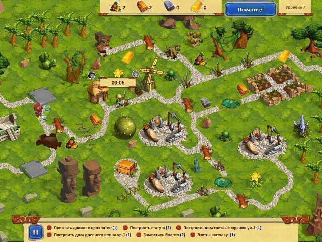 Собирайте ресурсы еды и строительных материалов, чтобы возвести полезные постройки, замостить болота и очистить дороги от завалов. Однако чтобы дело пошло быстрее, вам необходимо грамотно распределить свои силы и в первую очередь построить фермы и лесопилки, которые будут приносить еще больше необходимых ресурсов. Чтобы в считанные секунды древесина, золото и железо были собраны, вам не помешают дополнительные руки. Отстройте хижины и нанимайте себе помощников.