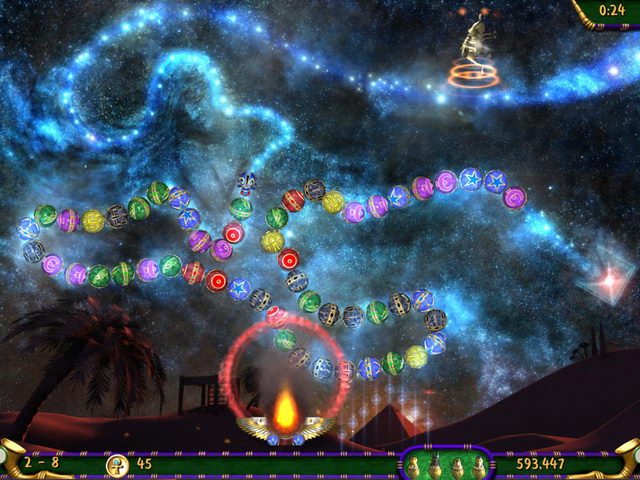 Такие сферы срабатывают по-разному: замедляют движение скарабеев, увеличивают скорость стрельбы, превращаются в огненный шар, который взрывается и уничтожает все ближайшие шарики. Словом, преподносят воинам Сета множество неприятных сюрпризов. Если у вас получится по-настоящему разозлить повелителя ночи, то вы сможете услышать его: он иногда ругается за кадром по-древнеегипетски.
