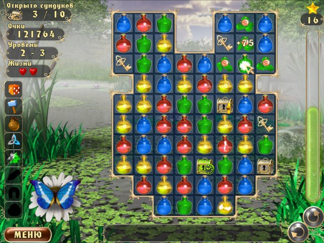 В особо сложных случаях пользуйтесь бонусами: если собрать линию из четырех одинаковых фишек, то на уровне появится бутылочка с горизонтальной молнией, которая способна уничтожить весь ряд. Ну а за комбинацию из пяти и более бутылочек наградой станет двойная молния, очищающая горизонталь и вертикаль.