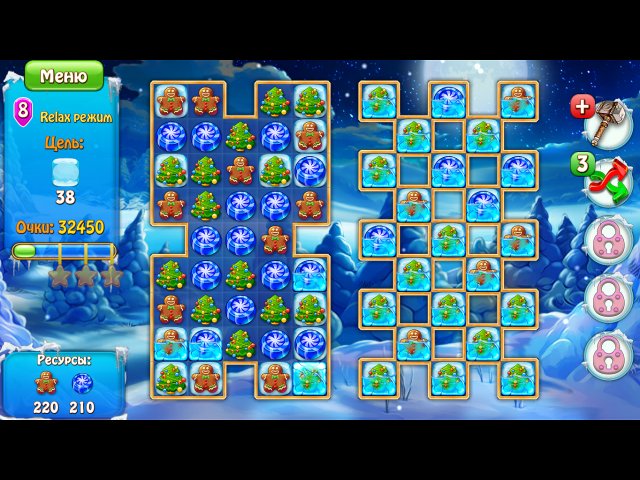 Кроме этих незначительных препятствий, надоедать вам будут снеговые тучки, засыпающие фишки снегом, наглые снеговики, пожирающие ближайшие плитки, и пауки-кочевники. Старайтесь в первую очередь избавиться от них, чтобы как можно быстрее достичь цели. А если свои силы уже на исходе, используйте бонусы.