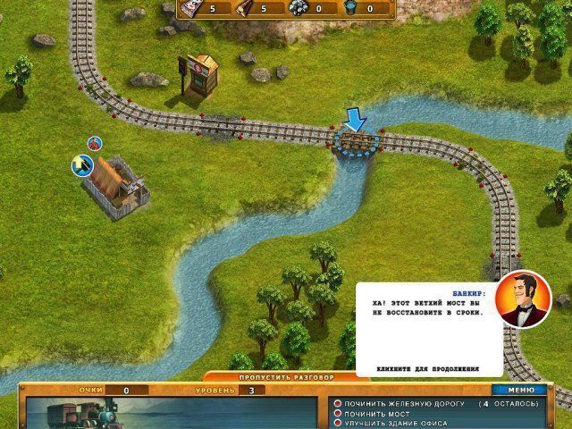 На железной дороге сорок станций, которые нуждаются в ремонте. Восстанавливайте по одному участку в день, и тогда вы наверняка успеете вовремя вернуть кредит. Тем более, у вас есть расторопные помощники. Направьте их к месту поломки, и они решат задачу. Если мастеров будет мало, улучшите здание офиса, и тогда вы сможете нанять новых работников. Дайте им сразу несколько заданий, чтобы работа шла полным ходом.