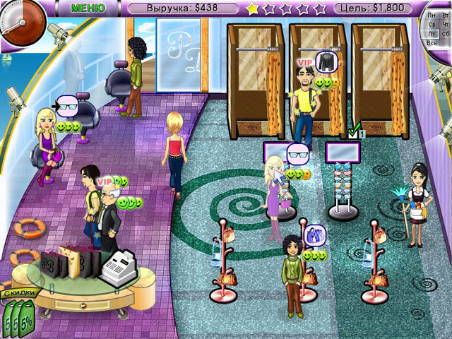 Старайтесь не упустить своих потенциальных клиентов. Для этого покупайте новые примерочные кабины, улучшайте кресла и стенды с аксессуарами, помогайте с выбором всем и каждому — и ваш бутик станет лучшим в городе. Но не спешите почивать на лаврах: этот магазинчик всего лишь первая ступень на пути к вашему успеху. Обожаемая тетушка решила постепенно передать под ваше начало всю сеть своих модных магазинов, а потому закатайте рукава и будьте готовы шаг за шагом покорять мир моды!