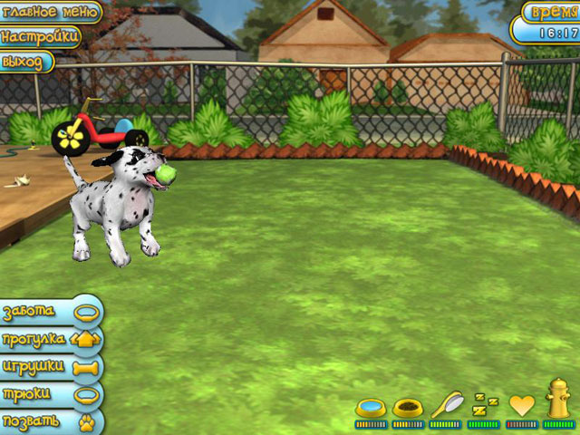 Вы можете выбрать пол, породу, окрас шерсти и возраст собаки (от 2,5 до 4 месяцев) из 6 предложенных вариантов. Придумайте щенку забавное имя и станьте его хозяином. Научитесь правильно ухаживать за ним — кормить, поить, расчесывать шерстку, мыть, водить на прогулку и обучать новым трюкам. Помните, что ваш щенок — живое существо, поэтому если вы будете плохо заботиться о нем, он может обидеться и стать непослушным.
