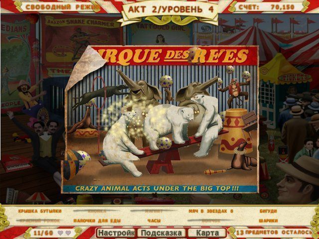 За кулисами всегда творится неразбериха. Чтобы продвигаться по карьерной лестнице, вам предстоит тщательно рассматривать сцены цирковой жизни, находить множество предметов, а иногда и совершать с ними какие-то действия (например, нарезать сыр). Кроме того, вы будете решать головоломки, среди которых — поиск отличий, составление афиш из фрагментов и многие другие. В конце каждого уровня один из найденных предметов послужит Матильде пропуском в новую цирковую профессию.