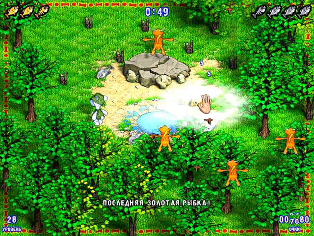Постепенно в игре появятся и медвежата — они будут помогать вам, возвращая растащенную котами рыбу на ее законное место. Еще один персонаж этой аркады — забавный сторожевой пес. Ему лень гонятся за кошками, — он любит поспать, поэтому легкий тонизирующий шлепок и для него не будет лишним.