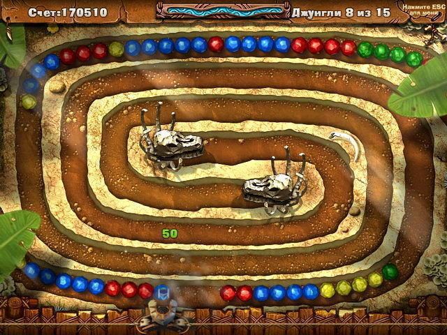 Быстрее проходить уровни вам помогут разнообразные бонусы. "Усиление" позволит эффективнее заполнять шкалу прохождения. "Хамелеон" у выбранного камешка меняет цвет на такой же, как у соседнего. "Цветное облако" окрашивает все фишки вокруг себя в один цвет. "Стоп" на несколько секунд замедляет движение цепочки камешков. Используйте бонусы и легко проходите уровень за уровнем! Награда — древние амулеты и собственная хижина в джунглях!