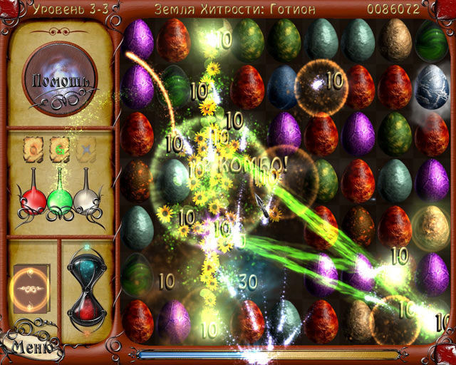 Темное колдовство злого волшебника будет всячески мешать вам, соединяя игровые элементы магическими цепями или замораживая их. Делайте комбо, собирая сразу несколько групп, и накапливайте положительную энергию. Ее вы сможете использовать для разрушения колдовских чар. Если у вас получится собрать четыре яйца сразу, одно из них обретет волшебные свойства, которые очень помогут вам.