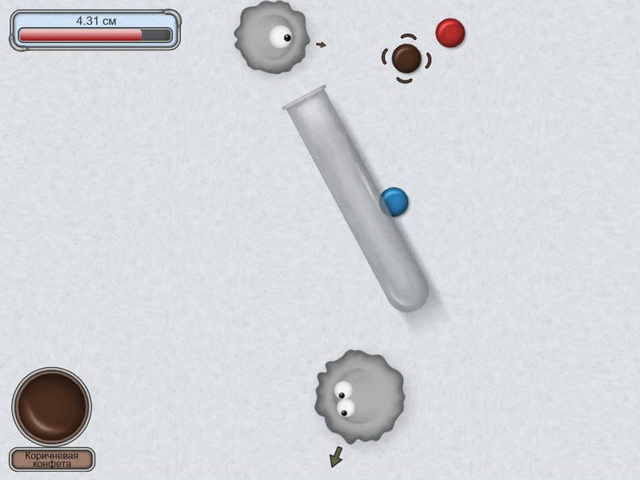 Началось все с того, что добрый ассистент профессора скормил ему пару конфет. Глазастик проглотил угощение, понял, в чем смысл его жизни, выбрался из аквариума и отправился добывать еду. Что съедобного можно найти в лаборатории? Много всего! Главное, чтобы пища по размеру была меньше Глазастика. Для начала нужно съесть все разноцветные пилюльки, флэшки, пробирки и всякую местную живность. Глазастик — существо непривередливое, гурманом его не назовешь!