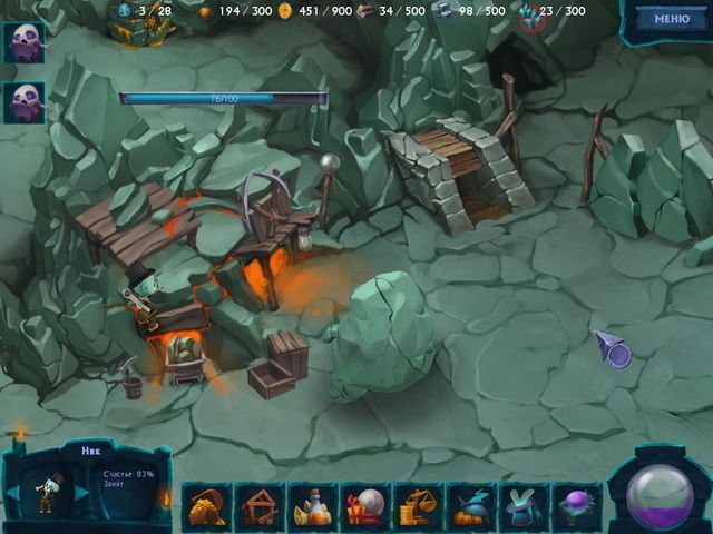 Чтобы грамотно организовать рабочий процесс в поселении отошедших в мир иной, вам потребуются ресурсы: золото, еда и древесина. Их наличие вы сможете отслеживать на специальной панели. Постарайтесь сделать так, чтобы ни один ваш подопечный не сидел без дела. Одного отправьте собирать волшебные грибы и сочные глазоягоды, другому дайте в руки топор, чтобы заготовил древесину, а третий пусть роет подвалы, где впоследствии будут храниться добытые ресурсы.