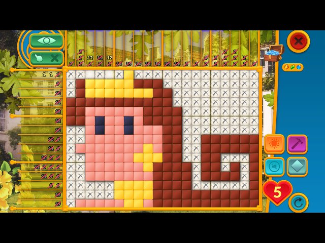Обращайте внимание на цифры слева и вверху и постарайтесь вычислить, где может находиться закрашенная плитка. Пользуйтесь бонусами, если они доступны. Только не кликайте по пустым клеткам бездумно. Так вы рискуете потерять жизни и начнете все заново.