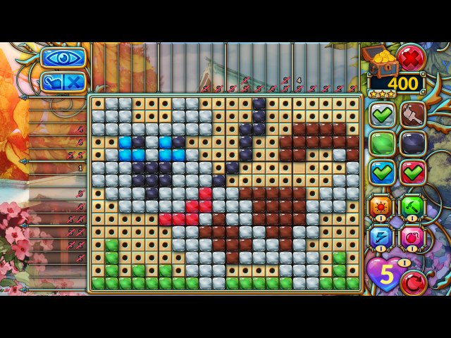 Каждая локация — одна из достопримечательностей Японии. Вы сможете не только развлечься, но и узнать много любопытных фактах об истории этого государства. А пока отправляйтесь на игровое поле. Вам предстоит расшифровать рисунок, который прячется за плитками. Вам решать: искать разноцветные кубики или пустые клетки. О том, сколько цветных кубиков и сколько их групп прячется в столбце или строке, подскажут цифры слева и сверху. Сопоставляйте данные и отрывайте плитки! Если вы сомневаетесь в следующем ходе, воспользуйтесь бонусом. К примеру, «молоток» разобьет плитки и откроет как пустые, так и разноцветные кубики. А вот «молния» поможет открыть цветные кубики.