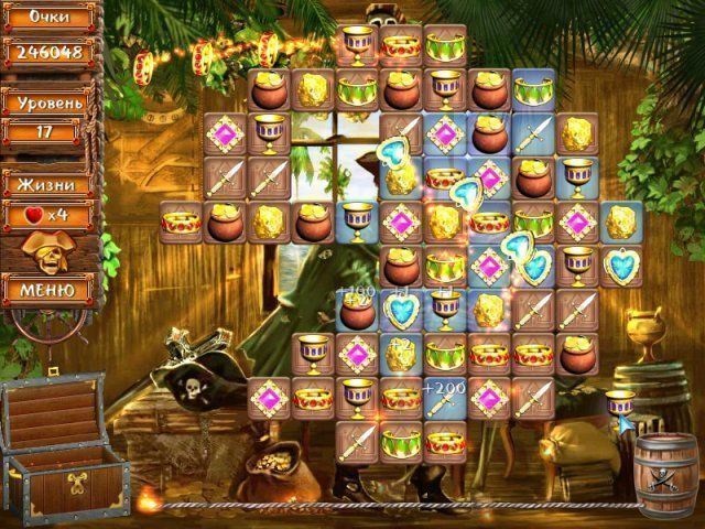 Сломать их не удастся, поэтому придется действовать хитростью: чтобы добраться до заветных пиастров придется решить множество увлекательных логических задачек. На каждом уровне вам предстоит очистить игровое поле от темных ячеек, которые преграждают путь к сокровищам. Для этого необходимо передвигать самоцветы, золотые дублоны и прочие драгоценности таким образом, чтобы после каждого хода получалась горизонтальная, вертикальная или диагональная цепочка из трех (и более) одинаковых фишек.