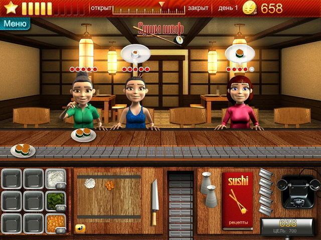 Каждый день работы в суши-баре у вас будет цель — заработать определенное количество монет. Если ваша дневная выручка достигнет этой планки, то тогда вы автоматически перейдете на другой уровень — и начнется новый день приятных хлопот за кулинарной стойкой! Чтобы наладить работу в вашем первом ресторане японской кухни, у вас есть ровно неделя. А затем расширяйте ассортимент, осваивайте новые рецепты, закупайте нужные ингредиенты и открывайте один суши-бар за другим!