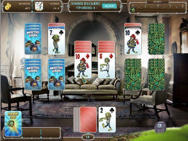 Пасьянс раскладывается по общим правилам. Внизу – колода, одна карта открыта. На нее нужно собирать карты из расклада. По достоинству они должны быть на один больше или меньше, чем карта в колоде. Например, если открыта семерка, то из расклада можно брать или шесть, или восемь. Бывает, что в раскладе некоторые карты заблокированы: зомби облепили вороны и мешают прицелиться. Ворон можно прогнать, если найти в раскладе специальную карту-пугач. А если карты затянуты зарослями – ищите карту-мачете.